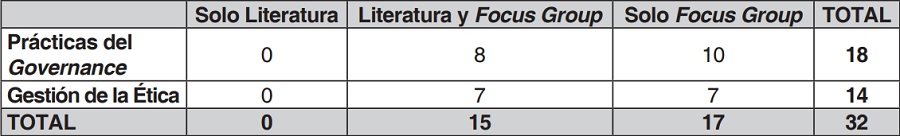 En este punto cabe destacar dos aspectos relevantes. Por una parte, que la revisión bibliográfica y el focus group coincidieron en identificar hasta 15 elementos comunes, 8 relacionados con prácticas de governance y 7 con la gestión de la ética. Respecto a este punto, los temas que la academia identificó como relevantes (y que no se habían incluido en las preguntas que ya venían formulado los índices de sostenibilidad) fueron los siguientes: la necesidad de incorporar la RSC a la visión y al propósito (Collins & Porras, 1996, Porter & Kramer, 2007; Babé et. al., 2016); incorporar criterios ESG al diseño de productos (Porter & Kramer, 2007; Kotsantonis, Pinney, & Serafeim, 2016); alinear la estructura de incentivos de los directivos a largo plazo (Eccles et al. 2012; Babe et al., 2016); incorporar la RSC en la cultura de la compañía y promover la cultura de la ética en toda la organización (Verhezen et al., 2010; Fernández Fernández, 2015); incluir indicadores de RSC / Sostenibilidad de forma trasparente el procesos y objetivos (Fernández Fernández, 2015); la necesidad de incorporar el whistleblowing, o líneas de denuncia anónima en el seno de las organizaciones (Meyers, 2016).