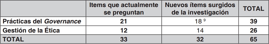 De esta forma, los 30 nuevos ítems que resultan de la investigación, se añaden así a los 25 por los que ya se venían preguntando en los Índices de Sostenibilidad más usados por las empresas (Pwc & Corporate Excellence, 2013) (Ver Tabla 3), lo cual daría lugar a un hipotético cuestionario sintético en materia de Gobierno Corporativo que estaría formado por 65 items, tal y como se recoge en la Tabla 3 y en el Anexo 1, en el que se muestra dicho cuestionario.