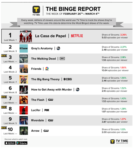 Desde el momento en que se estrenó en Netflix el 25 de diciembre de 2017, “La casa de papel” ha ocupado los primeros lugares del ranking de series más consumidas utilizando el procedimiento de los “atracones visuales” o binge-watching del mundo (TV Time, 2018). Pero, desde el 22 de enero, estuvo durante 5 semanas consecutivas en el primer lugar del mundo, convirtiéndose en un auténtico fenómeno, con una media de 6 episodios vistos por espectador y sesión de visionado4 (Figura 1).