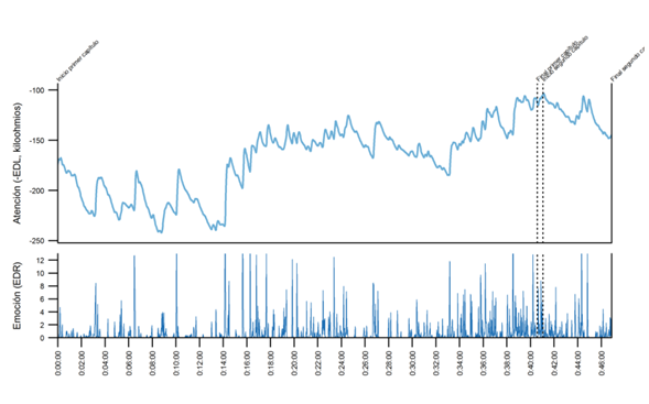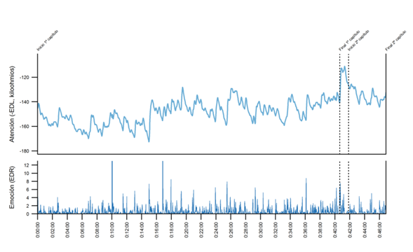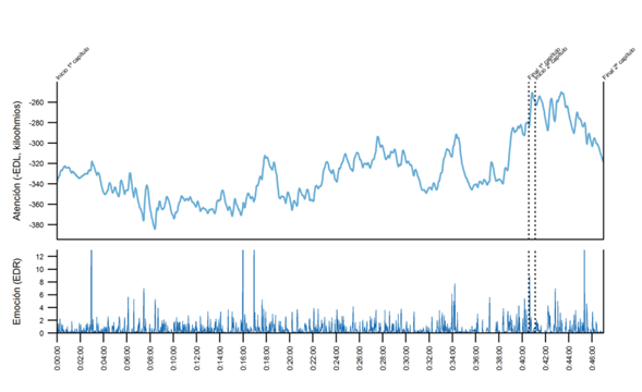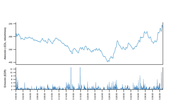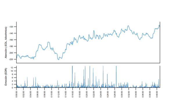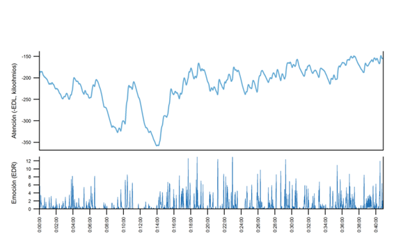 En este estudio lo que se ha medido es el nivel de atención y de emoción: un elemento extrínseco, que expresa el nivel de tensión —agrado o desagrado— respecto de los contenidos. Las emociones están en el plano afectivo, en el sentido más fisiológico —a diferencia de los sentimientos—, de ahí que pueda ser medible en función de su intensidad.