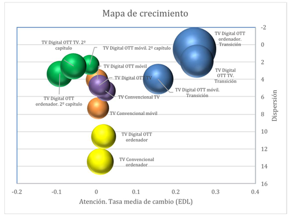 Así pues, la tendencia de las curvas de atención muestra que las plataformas OTT, en su conjunto, son las que mejor funcionan en cuanto nivel de atención y seguimiento activo o engagement. Por un lado, presentan una menor dispersión de la atención que las resultantes del consumo tradicional. Es decir, aunque obtienen en conjunto menores niveles de atención, esta crece de forma más estable.