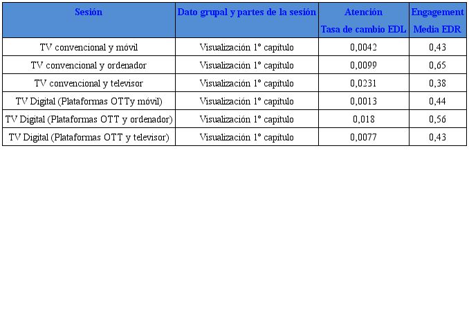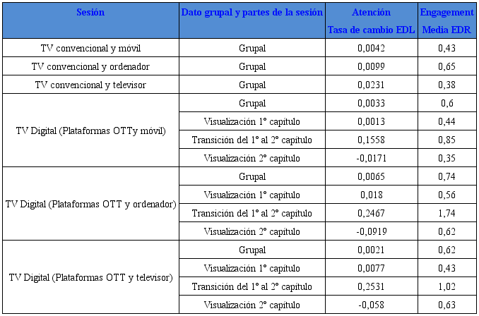 En el caso de la visualización de la televisión convencional, queda claro que el dispositivo que más ha conseguido despertar la atención de los espectadores ha sido la televisión. No obstante, este es también el que menos seguimiento activo o engagement ha generado con ellos. El móvil, por su parte, ha sido el soporte que menos niveles de atención ha despertado durante la proyección del capítulo. Por último, el ordenador ha sido el que mejores datos emocionales ha conseguido (Tabla 11).