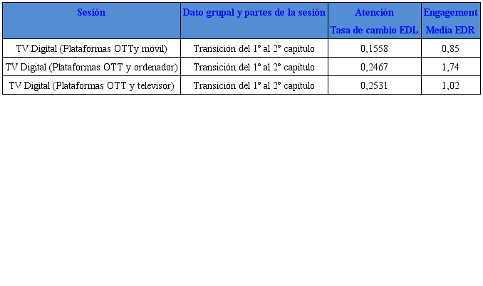 En las sesiones donde se visualizaba el capítulo a través de una plataforma OTT, la transición del primer al segundo capítulo provoca el mayor seguimiento activo (engagement) con la muestra del conjunto de la sesión. Además, en todas estas transiciones, se produce un aumento del nivel de atención (Figura 8).