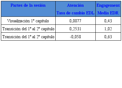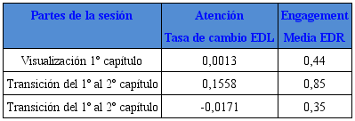La siguiente tabla muestra los resultados de los indicadores del nivel de atención (EDL) y nivel de emoción (EDR) para cada una de las sesiones, así como para sus partes (Tabla 10).