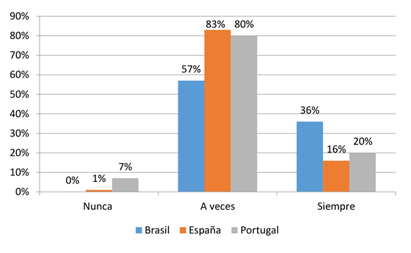 Sin diferenciación por nacionalidad, los jóvenes tienden a contrastar por varios medios las noticias que reciben, aunque sólo una minoría lo hace siempre, siendo los brasileños quienes más lo hacen. Sin embargo, los jóvenes españoles contrastan más noticias de varias fuentes cuando el contenido genera alarma social, mientras que los brasileños y portugueses tienden a hacerlo cuando el contenido es interesante.