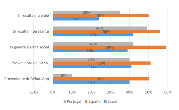 En cuanto a determinados rasgos que caracterizan a las noticias falsas y a su difusión, se observan datos especialmente notables que, en casos como la mayor propagación de estas informaciones en época electoral, puede responder a las respectivas coyunturas político-económicas: En Brasil, donde los últimos comicios presidenciales dieron una sorprendente victoria al ultraconservador Bolsonaro, hacen despertar la alarma entre los jóvenes de ese país hacia las fake news; igualmente son más receptivos que los europeos en captar su mayor difusión en épocas de crisis. En otros aspectos, los países de habla portuguesa consideran, más que los españoles, que los individuos mediáticos son más propensos a ser objeto de estas noticias.