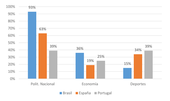 En cuanto a los ámbitos que consideran más susceptibles para englobar noticias falsas, las únicas diferencias significativas entre países se observan en los ámbitos de economía, deportes y muy especialmente en política nacional: la práctica totalidad de los americanos (93%), creen que las fake news responden a esta última temática, frente a casi dos tercios de los españoles (63%) y un 39% de los portugueses, En los otros dos ámbitos sí hay diferencias, pero no son tan abrumadoras (Figura 3).