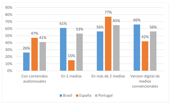 A pesar de que el uso de redes sociales para consultar noticias está generalizado debido, entre otras cuestiones, a que los encuestados responden a la generación de los llamados Millenials, sí se observan inclinaciones diversas por una red u otra, y las más recurrentes para este cometido se corresponden con las que actualmente son más populares en esta franja etaria, a saber y por este orden: Instagram, Twitter, Youtube y Facebook. Entre estas, los brasileños optan por Instagram, los portugueses por Facebook y los españoles por Twitter. La red audiovisual también es una vía preferente para los encuestados, pero en menor medida que las otras tres señaladas.