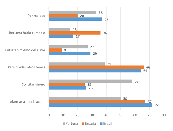 Desprestigiar a individuos influyentes en la esfera pública es mayoritariamente el motivo que todos los estudiantes consideran que está detrás de la mayoría de las noticias falsas. Sin embargo, otras posibles causas son percibidas de forma diferente entre unos estudiantes y otros: una gran parte de los portugueses creen que estos contenidos se pueden utilizar para solicitar y/o reclamar dinero, mientras que los españoles y brasileños creen que las fake news sirven para desviar la atención de otros problemas y para alarmar a la población.