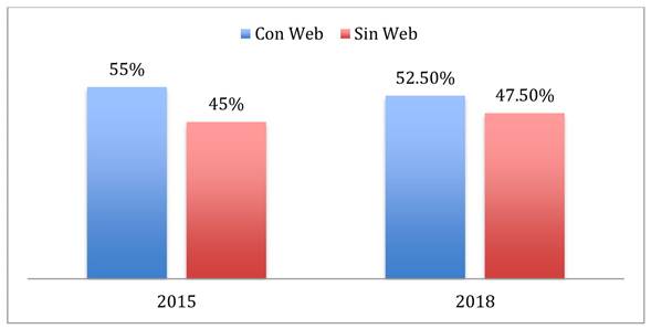 Un primer dato es que la cantidad de sitios webs disminuye en número el 2018, respecto del 2015. Mientras el 2015 un 55% del total de Diputados contaba con un sitio web, el 2018 baja a un 52,5 % de los Diputados. Asimismo, los Diputados sin sitio web pasan de un 45% a 47,5% en los años 2015, 2018, respectivamente. (Figura 1).