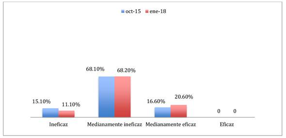 El porcentaje de sitios medianamente ineficaces es casi el mismo para el 2015 (Figura 2) y 2018, un 68,1% para el 2015 y un 68,2% para el 2018. Sin embargo, existe diferencia a favor de los sitios medianamente eficaces el 2018, donde suben a un 20,6% contrastando con el 16,6% del 2015. Los sitios ineficaces en tanto bajan de un 15,1% del universo el 2015 a sólo un 11,1% el 2018 (Figura 2).