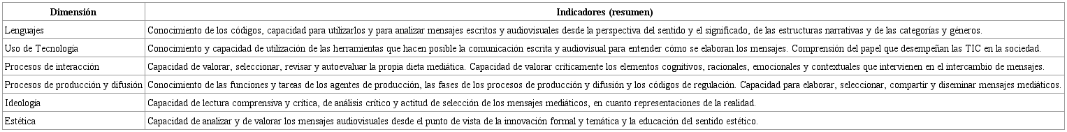 Posteriormente, el 2012, Ferrés y Piscitelli propusieron una nueva versión de la competencia a partir de la existente. Esta propuesta fue consensuada con 50 expertos de Iberoamérica y se organizó en torno a seis dimensiones: lenguajes, tecnología, procesos de interacción, procesos de producción y difusión, ideología y valores y estética (Tabla 2). La competencia mediática propuesta por los autores fue definida como la “capacidad de interactuar de manera crítica con mensajes mediáticos producidos por los demás, y siendo capaz de producir y de diseminar mensajes propios” (pp. 77-78). Esta capacidad incluye dentro de sus indicadores el descubrir la manera en que las representaciones mediáticas estructuran nuestra percepción de la realidad y evaluar la fiabilidad de las fuentes de información.
