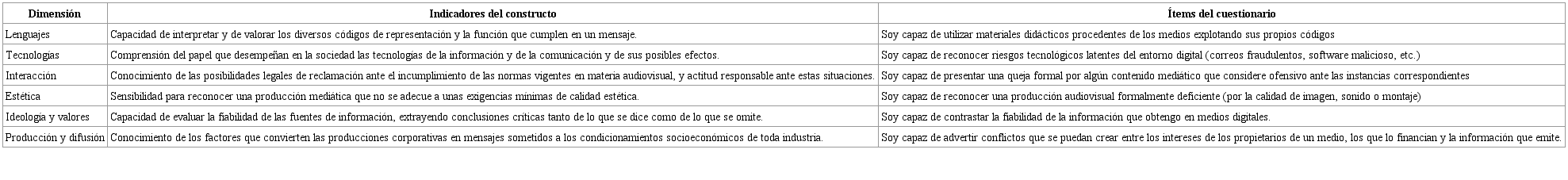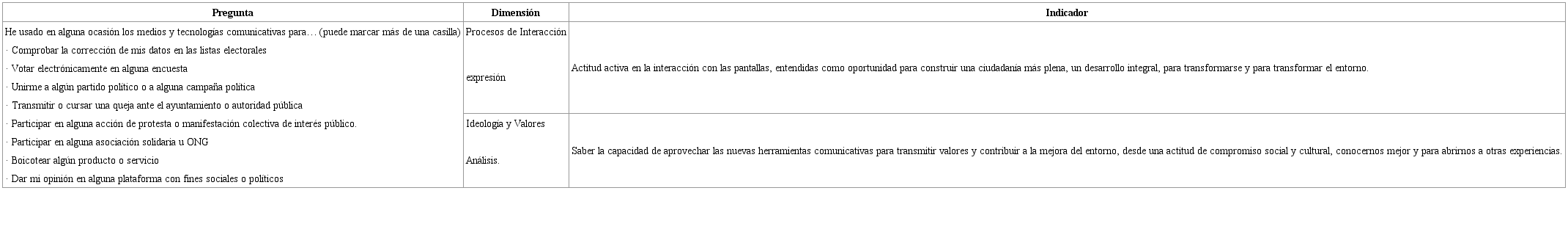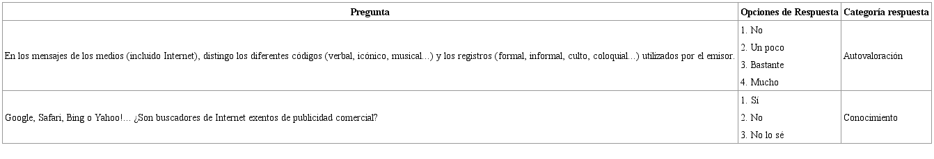 Finalmente, se optó porque cada pregunta midiera de manera aislada un indicador de una dimensión de la competencia mediática. Esta alternativa se tomó para facilitar el análisis, porque, como hemos señalado, las dimensiones del cuestionario original no eran las mismas que en su versión adaptada, y debido a que las respuestas presentaban una dificultad de comparación por tener opciones de autovaloración en escala de Likert y dicotómicas.