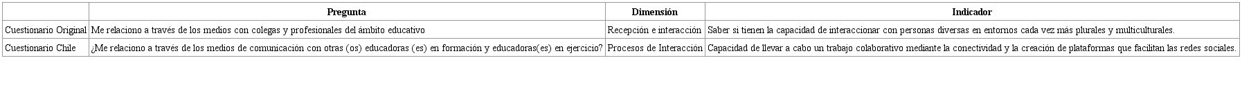 Una segunda complicación fue adaptar el lenguaje al contexto chileno y revisar la pertinencia de las preguntas referidas a la tecnología. Lo segundo implica un desafío respecto a preguntas muy específicas que pierden validez con el tiempo debido al desarrollo tecnológico. Una tercera dificultad fue referida al análisis. Surgieron los siguientes interrogantes: ¿Cada pregunta debe medir solo un indicador de una dimensión o se puede medir más de uno? Si es lo primero, ¿es posible aislar cada aspecto de una dimensión (indicador)? Si es lo segundo, ¿sigue siendo válido un cuestionario en el que las preguntas miden más de una dimensión? Si la respuesta es afirmativa, ¿se pueden seguir comparando las dimensiones? Para complicar más lo anterior, encontramos preguntas que se ajustaban bastante a dos indicadores (Tabla 4).
