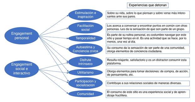 Para Davis Mersey, Calder y Malthouse (2010) estas experiencias de los usuarios tienen una dimensión personal y una social-interactiva. La personal hace referencia al conjunto de manifestaciones que las personas suelen tener con medios tradicionales; por otro lado, la parte social-interactiva es más específica para el consumo de medios en internet, e incluso este conjunto de experiencias se comparten con lo que un usuario experimenta consumiendo redes sociales. En general, a través del consumo de medios de comunicación, no importa cuál sea su formato, las personas buscamos estimulación, inspiración, interacción con otras personas a propósito del contenido, afirmación de autoestima y sensaciones intrínsecas de gozo o satisfacción. En las experiencias de engagement social-interactivo siempre están incluidas las personales. En complementariedad, el compromiso social-interactivo está motivado por la relevancia social y una experiencia de compromiso y de comunidad mucho más amplia, por eso se valoran en estas dimensiones aspectos relativos a la participación con otros y la socialización. El sentido de utilidad y de gozo intrínseco también están presentes en estas experiencias de implicación.