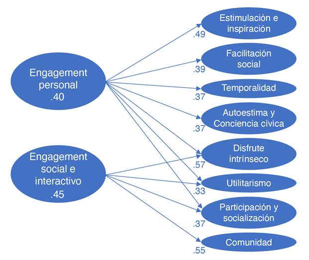 Las dimensiones planteadas por dichos autores comprenden: experiencias de estimulación e inspiración, de facilitación social, de temporalidad, de autoestima y conciencia cívica, de entretenimiento intrínseco, utilidad, participación y socialización y sentido de comunidad. De acuerdo a este modelo, algunas dimensiones comprenden experiencias de engagement individual y otras experiencias sociales e interactivas (ver figura 1). A partir de 37 experiencias concretas se genera el cuestionario de medición seleccionado para este trabajo de investigación.