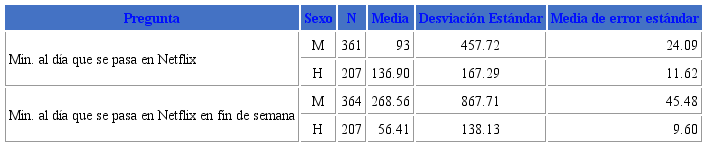 Este análisis permite pues responder a la pregunta de investigación, logrando identificar tipos de experiencias de consumo con Netflix. Así mismo se encontró una dedicación de tiempo relevante al consumo de contenido digital, la incorporación de rutinas a sus actividades diarias, la socialización de contenidos que están viendo en plataformas como temas de conversación con sus pares y la detonación de su interés por determinados temas. La edad es un factor relevante para el tipo de consumo, para el pago por plataformas, en donde el 96.7% de la muestra paga por un servicio mensual de manera propia o bien, por sus familias; y, de nuevo, para el tiempo que se consume, según los datos obtenidos en esta encuesta, explicados ya con antelación.