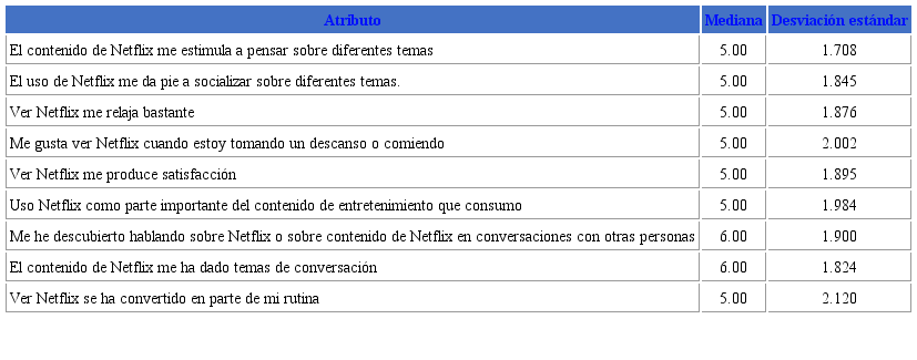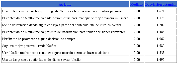 La prueba de alfa de Cronbach permitió determinar una consistencia interna alta de cada uno de los constructos analizados. En este sentido, los resultados nos permiten determinar que las experiencias medidas para Netflix nos arrojan resultados confiables, pues se ubican entre el (.946). Es decir, el modelo de Davis Mersey, Calder y Malthouse es útil para medir la experiencia de engagement de los usuarios. Posterior al análisis de fiabilidad, se hicieron dos tipos de análisis, uno descriptivo, para conocer las medianas y la desviación estándar de los atributos de engagement. Para representar estos resultados se tomó la decisión de solo elegir aquellos que tenían una mediana por arriba de 5.00 (ver Tabla 2), tomando en cuenta que la escala fue del 1 al 7; y para los atributos más bajos por plataforma fueron elegidos los que presentaron una mediana por debajo de 2.