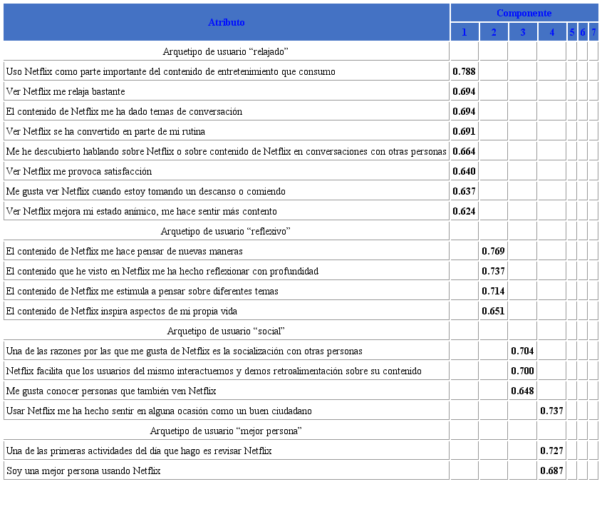 Para descubrir las experiencias de los millennials mexicanos con Netflix, el análisis factorial exploratorio sirvió para minimizar los atributos de engagement presentes en su consumo. Este tipo de análisis permitió descubrir experiencias de uso más significativo, tomando en cuenta que se considera una variable de correlación alta aquella que está muy cercana o por encima del 0.6. Este análisis también ayuda a confirmar la validez de los constructos en relación a lo que estamos midiendo: dimensiones de engagement con Netflix.