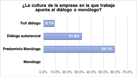 Con respecto a la real apertura a escuchar el gráfico 1 refleja la percepción que tienen los ejecutivos entrevistados de la cultura de la empresa expresada en cuatro categorías que van desde el monólogo hasta el full diálogo. Al respecto, cabe recordar como señala Burnside-Lawry (2012) que el diálogo lleva implícito escucha activa e intercambio de conocimiento.