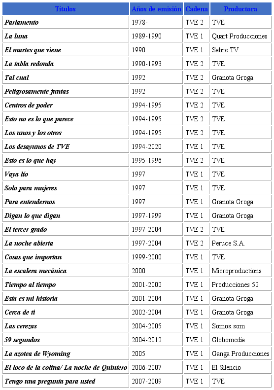 En el presente artículo, se citan un total de 27 títulos, 13 de producción propia interna y 14 de productoras independientes (tabla 1). Algunas de las empresas de producción que realizaron talk shows para TVE estaban vinculadas a los propios protagonistas de estos espacios (Guerrero, 2010b: 162), como es el caso de La Granota Groga (José Ramín Lluch), Julia Otero (Somos.som) o Pedro Ruiz (Peruce).