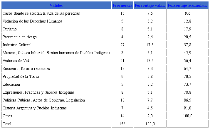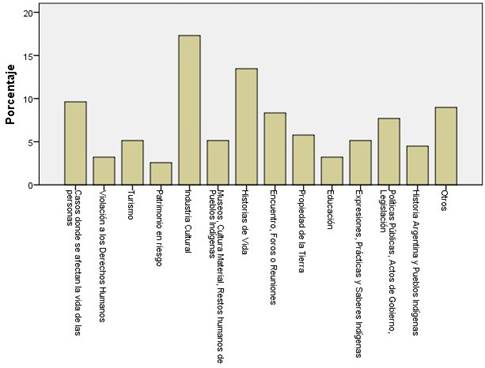 La variable “tópico principal de la nota” fue construida a partir de una aproximación inductiva sobre 40 notas y quedó constituida con las siguientes categorías: 1) Casos donde se afecta/ó la integridad física de las personas; 2) Industria cultural: producciones artísticas culturales que hacen referencia a la situación de los pueblos indígenas; 3) Museos, cultura material y restos humanos de pueblos indígenas; 4) Historias de vida; 5) Encuentros, foros, cumbres o reuniones; 6) Propiedad de la tierra; 7) Educación; 8) Expresiones, prácticas y saberes indígenas; 9) Políticas públicas, decisiones de gobierno y legislación; 10) Violación a los Derechos Humanos; 11) Turismo; 12) Patrimonio en riesgo; 13) Revisión de la historia Argentina; 14) Otros.