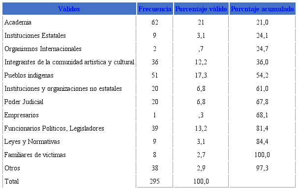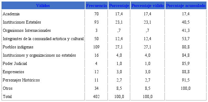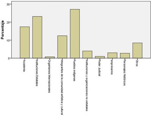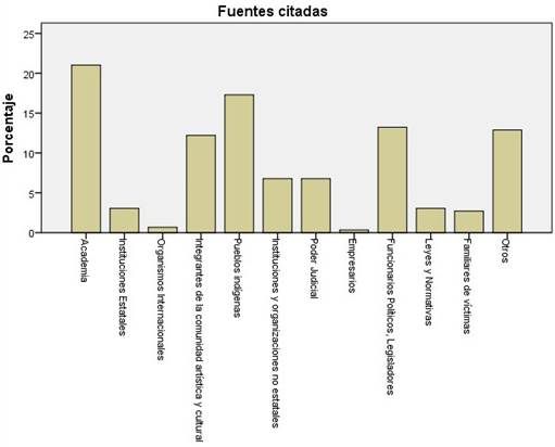 En aquellos casos donde fue posible computar las fuentes de la información, las más consultadas fueron las “académicas” (21%), es decir aquellas que fundamentan su inclusión desde el conocimiento científico o experto sobre una temática particular. En segundo término, se encontraron las voces de los pueblos indígenas (17,3%) quienes generalmente manifiestan sus problemáticas, demandas, preocupaciones, saberes, tradiciones culturales. En tercer lugar, se hallaron las fuentes institucionales del Estado (13,2%), representadas en el discurso de funcionarios y legisladores. Finalmente, los artistas y representantes del ámbito cultural (12,2%) que al expresar solidaridad a las luchas del movimiento indígena en Argentina poseen un lugar recurrente en la agenda mediática (ver tabla 4 y figura 3).