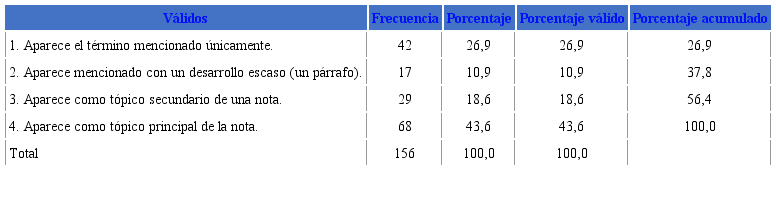 Luego de la codificación inicial se incorporó una nueva variable de análisis en relación al espacio asignado a los pueblos indígenas en cada artículo, el cual quedó codificado en 4 categorías: 1) Aparece el término mencionado únicamente; 2) Aparece mencionado con un desarrollo escaso (de uno a dos párrafos); 3) Aparece como tópico secundario de una nota; 4) Aparece como tópico principal de la nota.