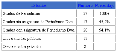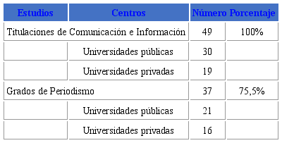 Del total de 49 universidades españolas que encontramos con titulaciones de Información y Comunicación, no hay Grado de Periodismo en 12 (Tabla 1): Alicante (grado de Publicidad y Relaciones Públicas), Vigo (grados de Publicidad y Relaciones Públicas y de Comunicación Audiovisual), Granada (grados de Comunicación Audiovisual y de Información y Documentación), Coruña (Comunicación Audiovisual), Lleida (Comunicación y Periodismo Audiovisual), Universidad de Barcelona (Comunicación e Industrias Culturales o en otra Facultad, Comunicación Audiovisual y/o Gestión de la Información y la Documentación Digital son los grados), Salamanca (USAL) (Grados de Comunicación Audiovisual y de Comunicación Creación Audiovisual), Universitat Oberta de Catalunya-UOC (Grado de Comunicación), Politécnica de Valencia (Comunicación Audiovisual en campus de Gandía), Cádiz (Publicidad y RR.PP. en Jerez de la Frontera), Loyola Andalucía (Grado de Comunicación) y Camilo José Cela (Grado de Comunicación).