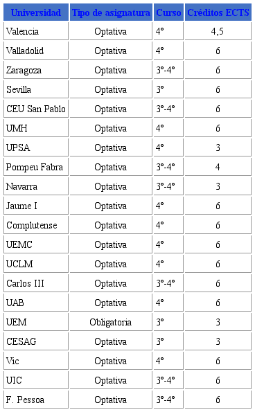 En la mayoría de los casos (ver Tabla 3) se trata de una materia optativa de tercer o cuarto curso, con raras excepciones como la Universidad Europea de Madrid, donde es obligatoria de tres créditos en Tercero y se llama “Deporte y Comunicación” o en CESAG, donde es optativa de tres créditos y lleva el nombre de “Deportes y medios de comunicación”.
