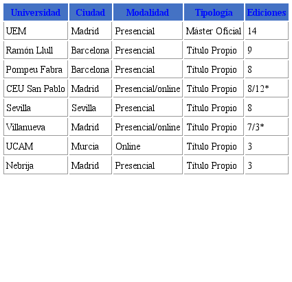 Para validar y ampliar los datos recabados desde un punto de vista cualitativo, a lo largo de la investigación se han enviado cuestionarios por correo electrónico y se han realizado varias consultas por vía telefónica a las personas responsables de la dirección y coordinación de cada una de estas titulaciones. Se obtuvieron respuesta en 7 de los 8 másteres estudiados. Las personas que atendieron las peticiones de información para este estudio fueron: Javier Vidaurreta (UEM), Sergi Cortiñas y Pablo Rausell (Universidad Pompeu Fabra), Arantxa Román (Universidad de Sevilla), Jordi Colomé (Universidad Ramón Llull), Pedro Luis Pérez (UCAM), Antonio Vaquerizo (Universidad Nebrija) y Juan Carlos Nieto y Juan Castro (CEU San Pablo-Marca).