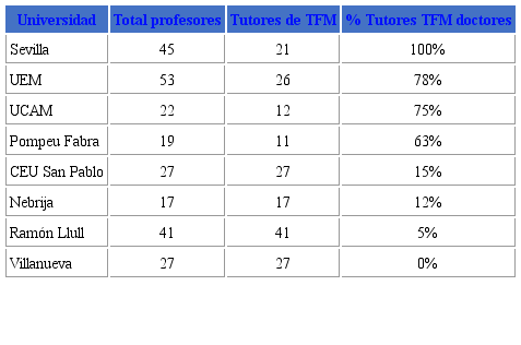 Igualmente acontece, por ejemplo, en el título propio de la Universidad de Sevilla. En este caso, de los 45 profesores solo 21 pueden acometer las tareas de tutorización porque para ello se precisa que sean doctores. En el supuesto de que un estudiante quiera hacer un trabajo que requiera una orientación más práctica o experimental, se recurre a quienes conforman el profesorado profesional, que actúan como asesores sin la posibilidad de cotutorizar. En la Universidad Pompeu Fabra, entretanto, la mayoría de los profesores que pueden dirigir un TFM son doctores, pero también pueden serlo otros perfiles con experiencia o trayectoria dando clases en la institución.