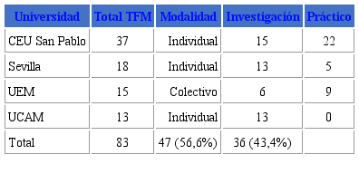 Por otra parte, el estudio señala que la producción de TFM en los másteres existentes en España sobre esta especialización no responde a objetivos de investigación precisamente porque todos excepto uno son títulos propios, de naturaleza profesionalizante y con fines de empleabilidad, y apenas incluyen módulos formativos sobre teorías y metodologías investigadoras en sus planes de estudio.