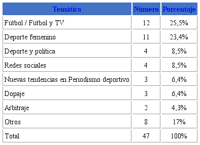 Además de clasificar los TFM defendidos en estos másteres por categoría formal, se han identificado las temáticas más habituales sobre las que han versado estos trabajos. Tal como se aprecia en la Tabla 7, predominan los que están relacionados con el fútbol (derechos de televisión, competiciones internacionales, marketing) y el deporte femenino (fútbol, pero también otros deportes como gimnasia o rugby, gestión y arbitraje).
