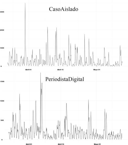 Como se ha apuntado arriba, la recogida ininterrumpida y análisis de tuits alrededor de los portales digitales CasoAislado.es y PeriodistaDigital.es fue realizada durante el periodo de Estado de Alarma por la pandemia de Covid-19. La fecha de inicio es desde el 22/03/2020 -seis días después de la publicación del Estado de Alarmahasta el 12/05/2020, casi dos meses más tarde. El número de tuits recogido fue de 166.431 (de un total de 48.098 cuentas) para Caso Aislado y de 119.640 (proveniente de 31.258 cuentas) para Periodista Digital. Entre los datos interesantes que apuntan a la existencia de cámaras de resonancia ideológicas es preciso señalar que se encontraron 14.594 cuentas que retuitean mensajes de ambos diarios digitales (30,34% y 46,69% del total de cuentas respectivamente), por lo que resulta evidente que comparten muchos usuarios entre sí.