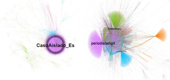 La naturaleza de los perfiles más importantes y la difusión del contenido es distinta en los dos portales: en Caso Aislado no existen cuentas claramente identificadas como creadoras de opinión que puedan ser catalogadas como influencers que arrastren a sus propios seguidoresaparte de la propia cuenta oficial del medio, pero sí se aprecia mucha difusión desde numerosas pequeñas. Por contra, desde Periodista Digital, la redifusión se produce a través de determinadas cuentas influencers que se van combinando entre sí: @CristinaSegui_, @hermanntertsch, @AlfonsoRojoPD y @NituPerez, correspondientes a conocidos columnistas en diversos medios de comunicación de España y Venezuela, así como el propio director del portal.