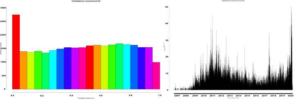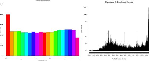 Al aplicar a la muestra el algoritmo de probabilidad que dilucida si un perfil es o comporta como un bot, de las 48.098 cuentas que intervienen alrededor de Caso Aislado y las 31.258 con Periodista Digital, se encuentran una gran cantidad de perfiles sospechosos de ser o actuar como programas automatizados por encima del 50%. Tal como puede observarse en las Imágenes 3 y 4, un total de