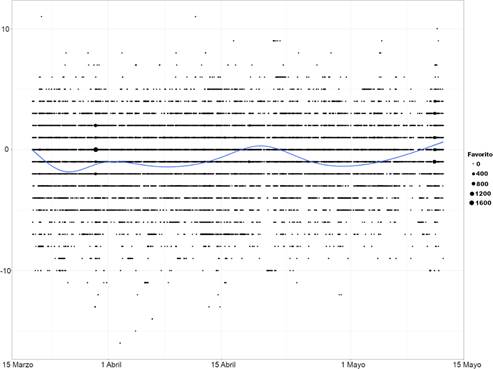 Análisis estadístico y gráfico, a través del software R, empleado para establecer gráficos entre las distintas variables obtenidas de cada tuit y de cada usuario.