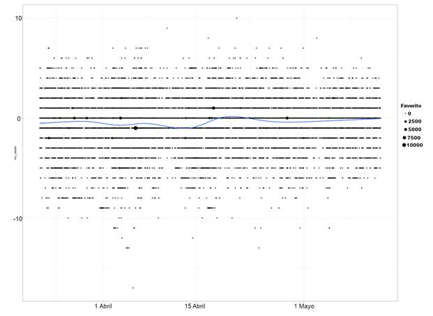 El análisis de polaridad y emociones a través del léxico, se determina que se emite un discurso predominantemente negativo. Como puede apreciarse en las Imágenes 5 y 6, en las que se representa el sentimiento o polarización positiva o negativa del contenido de la franja de tiempo analizada, los tuits emitidos presentan una gran carga de polarización. Pueden apreciarse muchos mensajes de gran intensidad (por encima de valores de 4), llegando a valores de 16-17 en ambos casos. Comparados con los niveles de vector de los principales diarios de información españoles expuestos en otros estudios (Arce García, Orviz Martínez y Cuervo Carabel, 2020) ambos perfiles arrojan, sin duda, una mayor polarización. La media del vector de sentimiento, representado en ambas figuras mediante una línea de tendencia azul, es siempre negativa y solo en breves momentos llega a acercarse a un valor neutro.