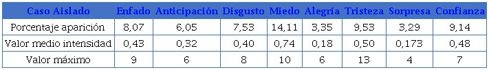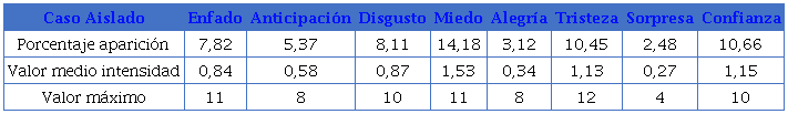 El análisis de emociones, reflejado en las Tablas 1 y 2, muestra que ambos discursos están liderados principalmente por el Miedo, seguidos a distancia por la Tristeza y Confianza, Disgusto y Enfado. La Alegría y la Sorpresa son testimoniales. De nuevo, se aprecia una mayor intensidad en las emociones, especialmente en el Miedo, alrededor de Caso Aislado.