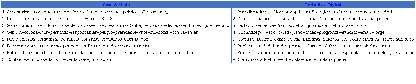 Atendiendo a las palabras usadas, se aprecia que los perfiles en Twitter no están recogiendo una variedad de palabras que atienda a lo que se espera de tal momento informativo. Los agrupamientos de palabras son en realidad alusiones genéricas a la pandemia y, sobre todo, a la coalición de Gobierno de PSOE y Unidas Podemos acusándoles de que mienten y de que son responsables de la extensión de la enfermedad e, incluso, suponen un peligro. Hay una intención clara por parte de ambos perfiles de asociar la pandemia y sus estragos con los principales dirigentes. Entre las diferencias apreciables, alrededor de Caso Aislado se confrontan los temas dando voz al partido Vox y a su líder Santiago Abascal, mientras que este tipo de referencias no aparecen en torno a Periodista Digital. Alrededor de Periodista Digital se produce un número considerable de ataques hacia otros medios de comunicación, con el canal de televisión estatal La Sexta (perteneciente a AtresMedia) a la cabeza.