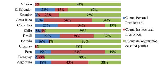 En la mayoría de los países los mensajes relacionados con la gestión de la COVID-19 se originaron desde las cuentas de los organismos encargados de la salud pública. Es el caso de Uruguay, Paraguay, Chile, México, El Salvador y Bolivia. Países como Colombia, Costa Rica, Brasil, Perú y Argentina tuvieron un volumen más alto de emisión desde las cuentas institucionales de la presidencia. Es interesante destacar que en los casos de Brasil, Colombia, El Salvador, Perú, Bolivia y Argentina hay un porcentaje significativo de mensajes originados desde las cuentas personales de los/as presidentes/as.