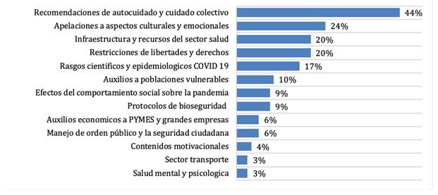 Ahora bien, al entrar a analizar los componentes de los mensajes se buscó determinar en primera instancia la composición de la agenda temática de la comunicación de gobierno orientada a la gestión de la pandemia (Gráfico 2).