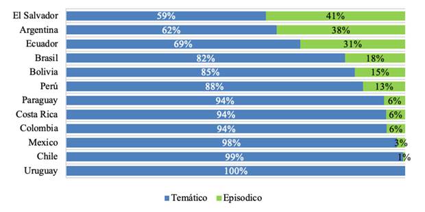 Los países que más incorporan un frame narrativo episódico son El Salvador, Argentina y Ecuador. Por su parte Uruguay, Chile y México son los que utilizan de manera mayoritaria el frame temático.