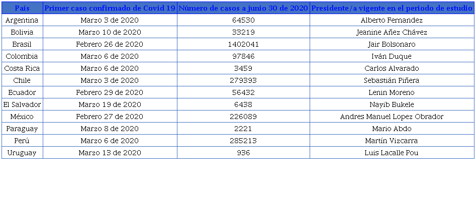 Se seleccionaron doce casos de estudio (Tabla 1) buscando una perspectiva comparativa entre países de Suramérica y Centroamérica, así como también por la diversidad ideológica y las posturas y soluciones implementadas para hacerle frente a la Covid-19. El periodo de estudio estuvo comprendido en cada caso desde el día del primer caso confirmado en cada país hasta la fecha de corte del 30 de junio, lo que en la mayoría de los casos comprendidos tuvo un lapso de aproximadamente cuatro meses.
