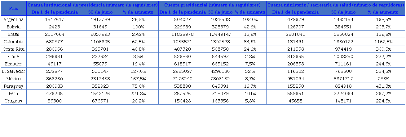 Por otra parte, se demuestra también la importancia que la población de cada país dio a las redes sociales como fuente de información inmediata y a tiempo real. El crecimiento de seguidores a las cuentas personales de los presidentes, cuentas de ministerios/secretarías de salud, es notorio, pues la mayoría logró aumentar en un número significativo a sus seguidores. El caso más notorio es el caso colombiano con la cuenta del Ministerio de Salud que tuvo un aumento de más de un millón de seguidores, con un porcentaje total de incremento de 1162%.