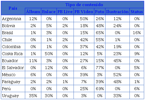 En total se analizaron 429 fotografías (30%), 389 ilustraciones (27%), 369 videos de Facebook (26%), 128 enlaces (9%) 63 álbumes fotográficos (9%), 36 status (3%) y 6 Facebook Live (1%).