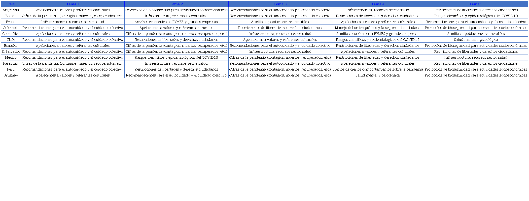 En cuanto a la agenda de temas, vista desde la comunicación de riesgo, se hubiera supuesto que las Recomendaciones para el autocuidado y el cuidado colectivo y los Protocolos de bioseguridad para actividades socioeconómicas, se instalaran como los primeros temas en las agendas de América Latina. Esto además, porque ya se contaba con un contexto previo a la actuación de países asiáticos y europeos, en donde se activaron desde un primer momento, estas medidas.