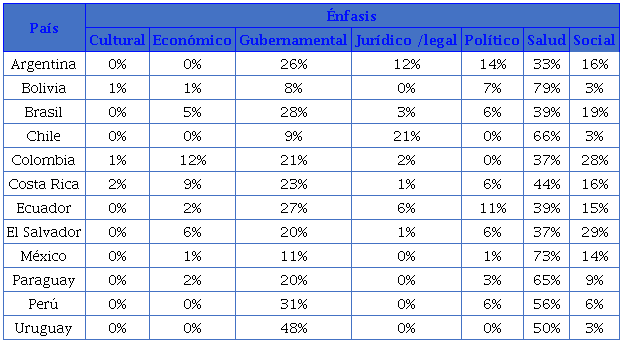 Revisando el uso de los énfasis en los casos particulares (Tabla 6) se encuentra que en la mayoría de los casos predomina el énfasis de salud pública, seguido del gubernamental. En algunos países como Colombia y El Salvador aparece el énfasis social en un 28% y 26% respectivamente. En Chile el énfasis jurídico/legal tiene un 21%.