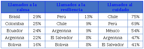 En la mayoría de los países primaron mensajes de llamado al cuidado, especialmente en aquellos donde los contagios escalaron de manera mas rápida y los gobiernos implementaron estrategias de prevención como Chile y Perú. En países como Brasil y Colombia, donde aparecen más altos los llamados a la calma, los primeros abordajes comunicativos, especialmente desde los discursos presidenciales apuntaban a posiciones más laxas frente a la llegada del virus. Incluso en el caso de Brasil, su presidente mantuvo una postura escéptica e incluso llamaba a sus ciudadanos a no creer en el virus y seguir con su vida común y corriente.